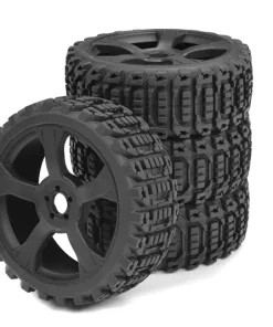 • Voorgelijmde XL Buggy-banden op zwarte 6-spaaks nylon velgen
