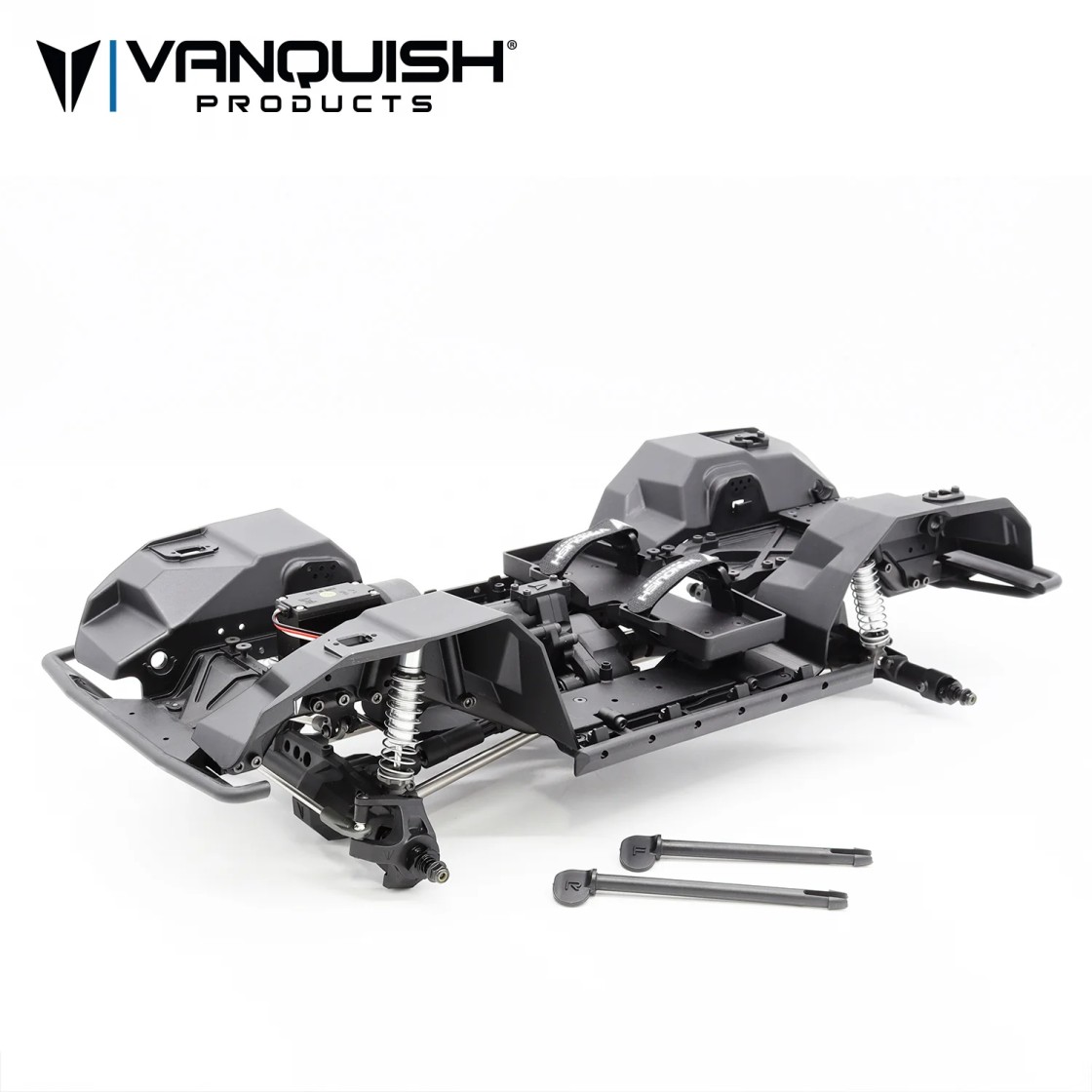 The Vanquish Products VS4-10 chassis is designed to provide a balance of scale looks and unhindered performance. The steel C-channel design provides scale detail. Molded front and rear crossmembers fill the chassis rails in the highest stress locations for ultimate strength and provide features like dual servo mounts, winch line routing, and a fuel cell. The molded rock sliders come with a replaceable outer portion. The panhard mount on the chassis is made from machined aluminum to withstand impacts in severe trail conditions. Molded inner fenders double as adjustable shock towers to capture the top of the 90mm Incision S8E shocks.